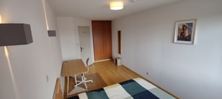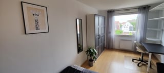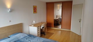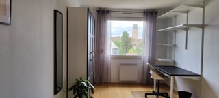 Chambre de 15m² avec un grand placard encastré, un lit double, un bureau, une chaise de bureau et une vue dégagée sur les jardins environnants.