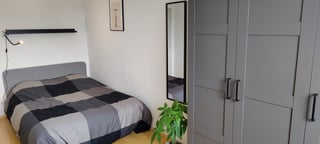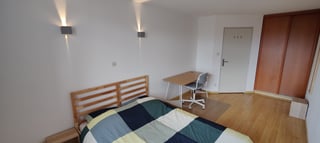 Chambre de 16m² avec placard encastré, un lit double, un bureau, une chaise de bureau et une vue sur la rue.
